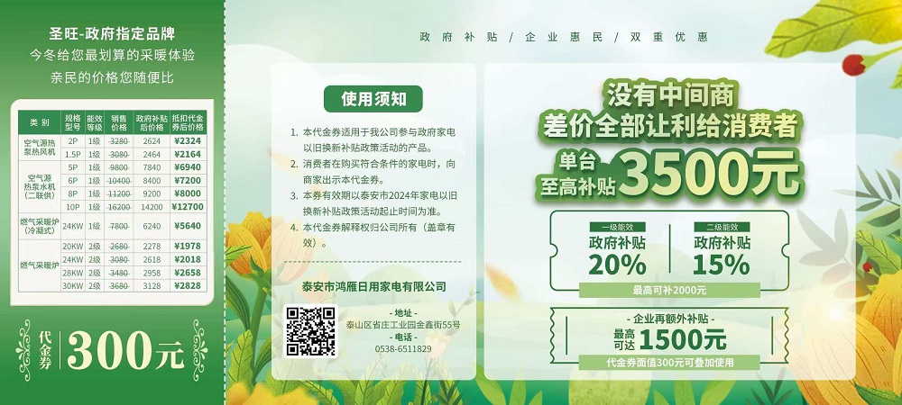 如今,泰安市舉行家電以舊換新補貼政策,我公司三類產品成功入圍,包括空氣源熱泵熱風機、冷水機組和燃氣壁掛爐。消費者購買我公司一級能耗產品可享受政府 20%的補貼,二級能耗產品可享受 15%的補貼。在此基礎上,我們面向全市消費者再額外發(fā)放 300 萬的代金券,單張面值 300 元,共 1 萬張。這意味著在政府補貼的同時,消費者還能享受我公司讓利 300 至最高 1500 元的優(yōu)惠,真正實現政企雙補,福利翻倍。